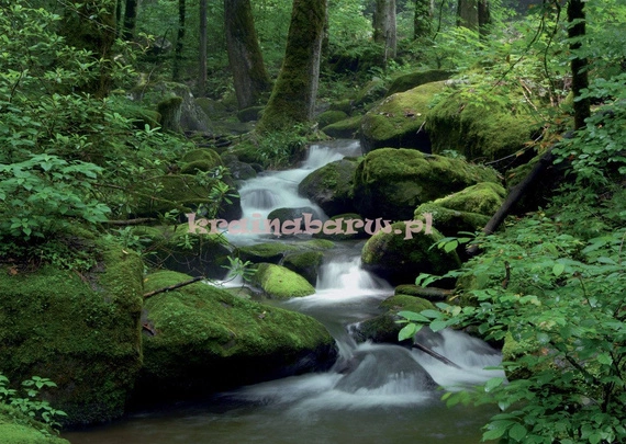 - Las, drzewo, krzak, liście, gałęzie, strumyk, potok, kamień, głaz