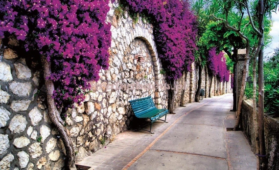 • murek, romantyczny, ławka, ławeczka, kwiaty, fioletowe
