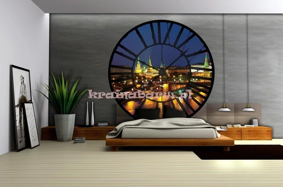 - Okrągła fototapeta na flizelinie WIDOK PRZEZ ZEGAR