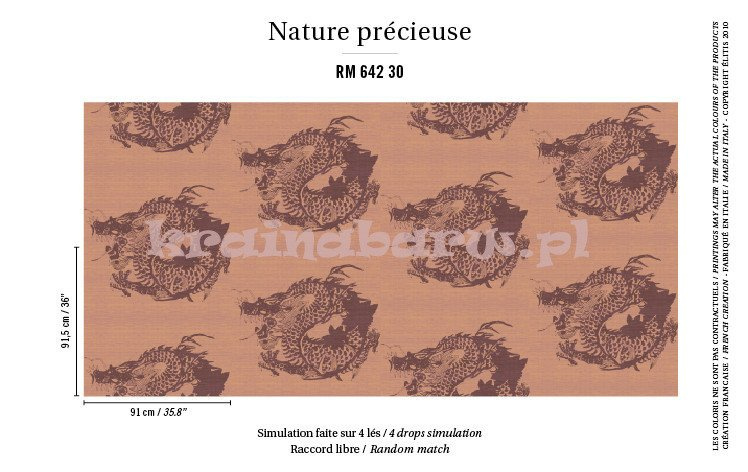 RM642 to tapeta na podłożu papierowym składająca się w 100% z naturalnych włókien. Wzór inspirowany jest majestatycznymi, azjatyckimi smokami.
