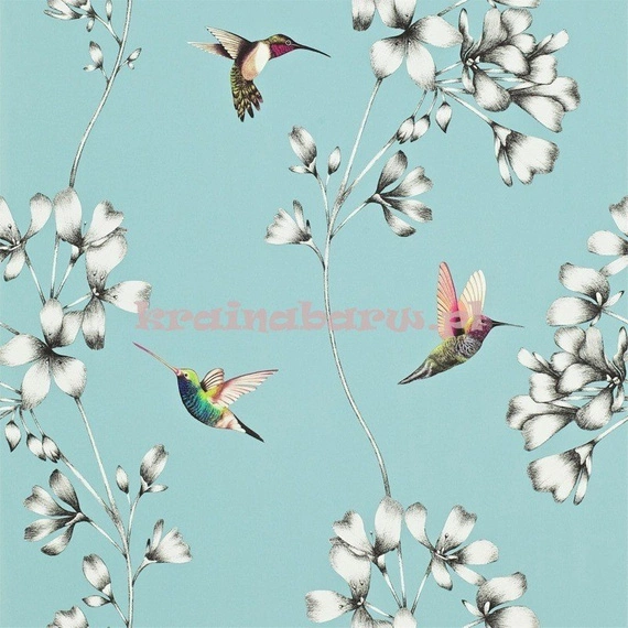 Romantyczna tapeta z nowoczesną grafiką z kolorowymi kolibrami wśród pięknie cieniowanych szaro czarnych kwiatów na matowym tle w odcieniu koloru niebieskiego z domieszką zieleni. Malownicza i elegancka tapeta stworzy przyjemny i modny klimat w Twoim wnętrzu.