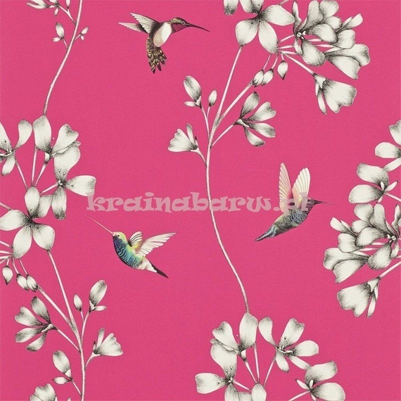 Drukowany cyfrowo wzór odzwierciedlający tropikalne kwiaty i latające trzy gatunki kolibrów, sporządzone w prawie naturalnych rozmiarach, tak aby przedstawiać jak najbardziej szczegółowe detale.
