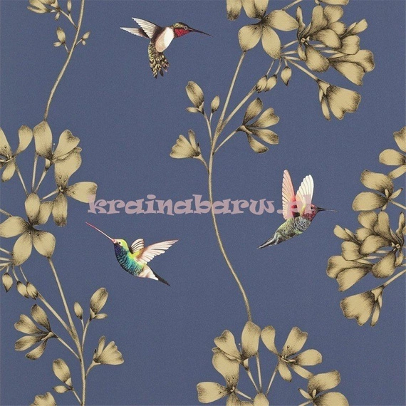 Drukowany cyfrowo wzór odzwierciedlający tropikalne kwiaty i latające trzy gatunki kolibrów, sporządzone w prawie naturalnych rozmiarach, tak aby przedstawiać jak najbardziej szczegółowe detale.