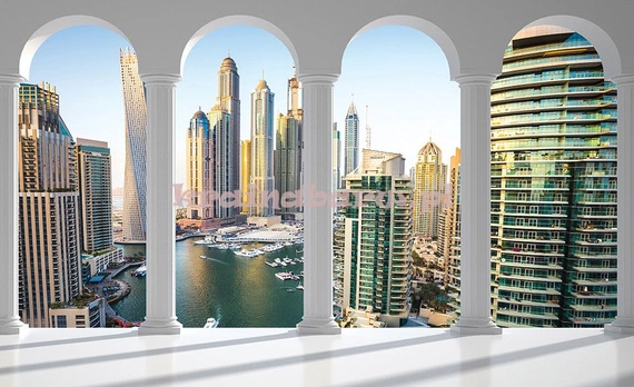 • Dubaj, wieżowce, zatoka, Emiraty Arabskie,kolumny, kolumnada, widok