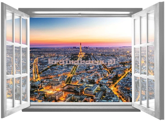 Widok prze okno na nocną panoramę Paryża.