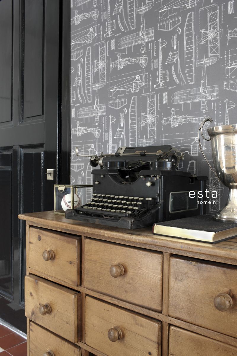 Tapeta z ze szkicami starych samolotów. W sam raz do pokoju młodego konstruktora. Szare tło z białymi liniami rysunków.