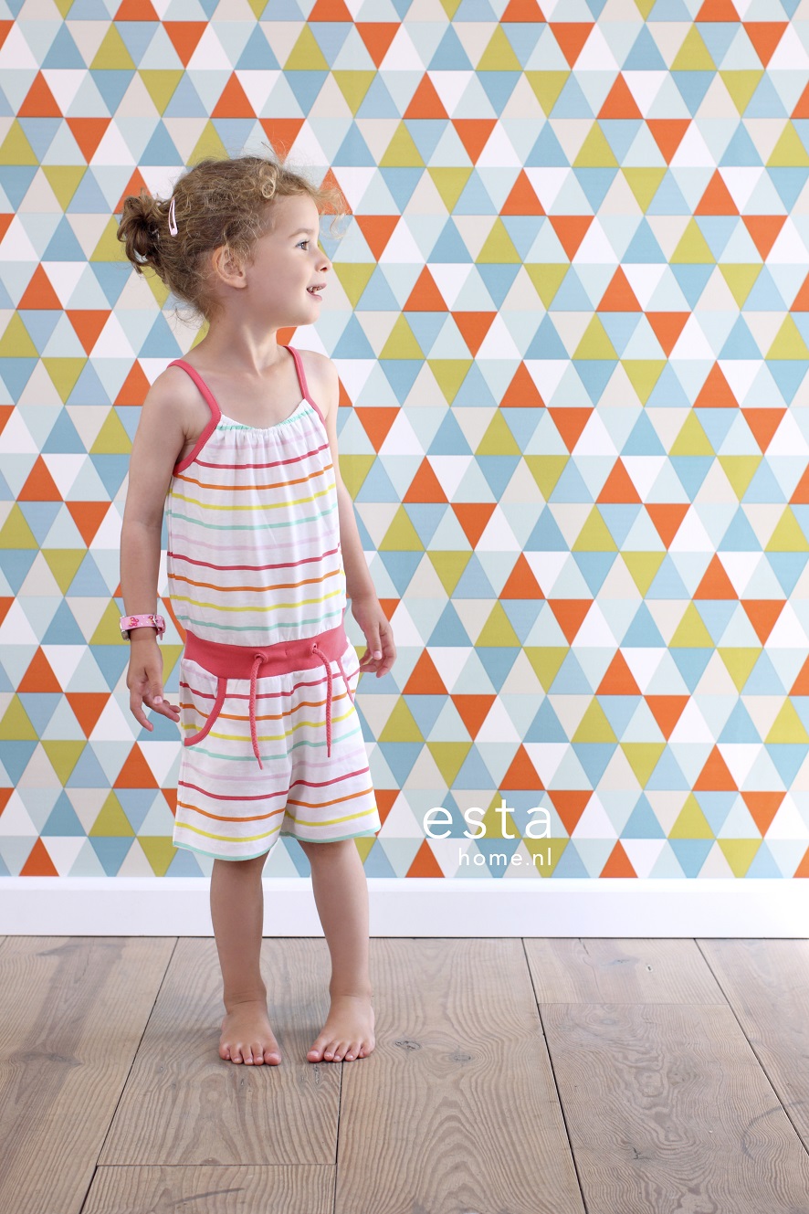 Tapeta w niebieskie trójkąty. Dominują tutaj odcienie niebieskiego, beżu i bieli. Tapeta idealna do pokojów dla chłopców i dziewczynek