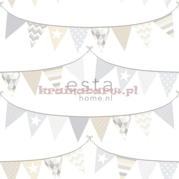Tapeta ze zwisającymi beżowymi, trójkątnymi banerami i chorągiewkami. Sa one naniesione na białe tło