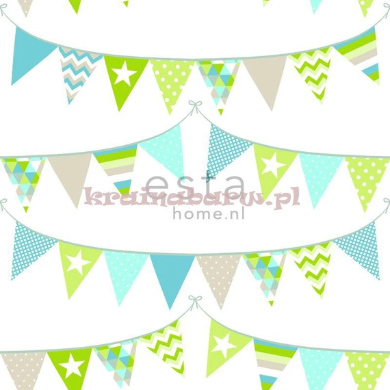 Tapeta ze zwisającymi niebiesko-zielonymi, trójkątnymi banerami i chorągiewkami. Sa one naniesione na białe tło