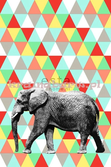 Panel ze słoniem naniesionym na tło w wielokolorowe trójkąty.