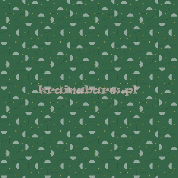 Wzór Primitive Micro. Tapeta w półkola, kreski i kółka. Widoczny wzór prezentuje nowczesne, abstrakcyjne spojrzenie na świat tapet. Wzory na tapecie zostały pomniejszone, dzięki czemu mają większą powtarzalność. Kolor zielony z szarymi półkolami.
