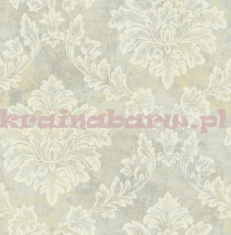 Wzór Framed Damask. Połyskująca tapeta z ornamentem na tle stylizowanym na starą powierzchnię. Jest ona w odcieniach szarości i beżu.