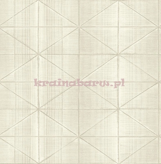 Geometryczna tapeta o nowoczesnym designie. Wzór układa się w łączące się trójkąty. Jest poprzecinany pionowymi, jaśniejszymi pasami. Będzie pasowała do pomysłowo urządzonych wnętrz. Jest ona jasno-beżowa z delikatnym połyskiem.