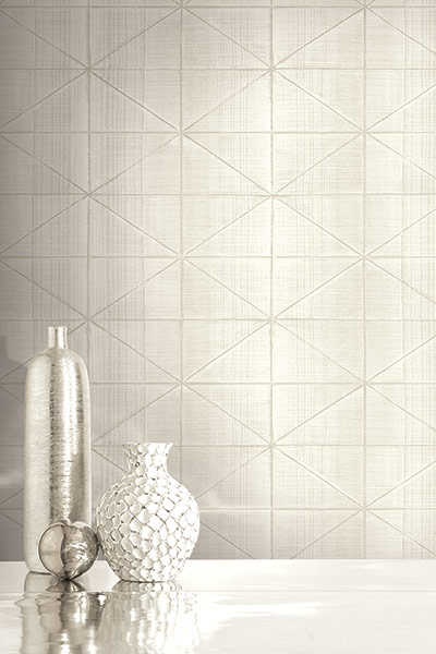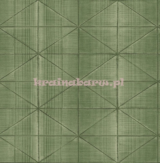 Geometryczna tapeta o nowoczesnym designie. Wzór układa się w łączące się trójkąty. Jest poprzecinany pionowymi, jaśniejszymi pasami. Będzie pasowała do pomysłowo urządzonych wnętrz. Mieni się ona w kolorze zielonym.