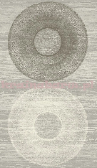 Tapeta z dużymi kołami naniesionymi na srebrzysto białe tło. Koła układają się w koronkowy wzór. Są one w kolorach białym i szarym.
