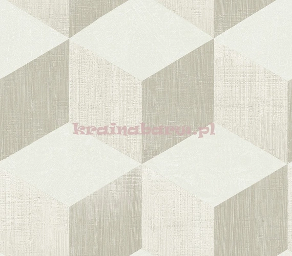 Nowoczesna tapeta z geometrycznym wzorem. Widać na niej trójwymiarowe sześciany, które tworzą wrażenie przestrzenności. Kolory kredowej bieli i szarości.