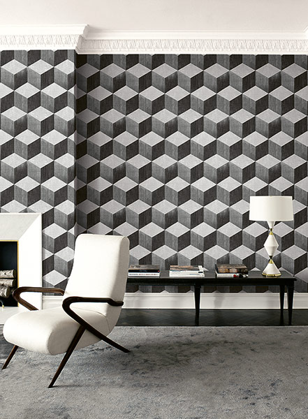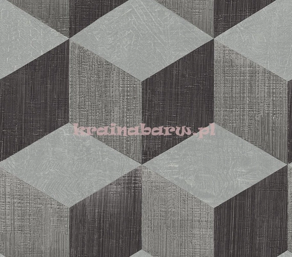 Nowoczesna tapeta z geometrycznym wzorem. Widać na niej trójwymiarowe sześciany, które tworzą wrażenie przestrzenności. Odcienie szarości i srebrnego.