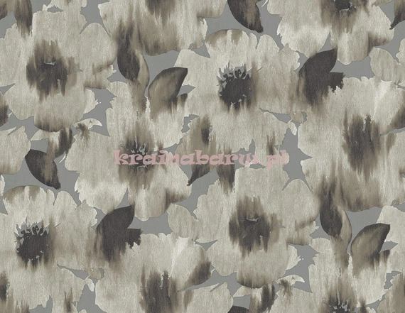 Nowoczesna tapeta z kwiecistym wzorem. Malowane, szarawe kwiatki z rozmytymi barwami są naniesione na jednokolorowe, srebrzyste tło.