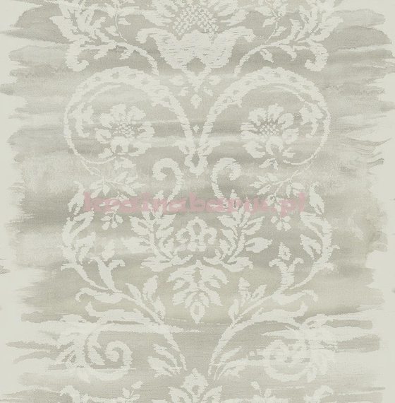 Tapeta z ornamentem naniesionym na rozmywające się tło. Jest ona w odcieniach przenikających się beży.