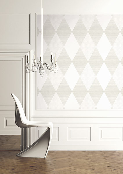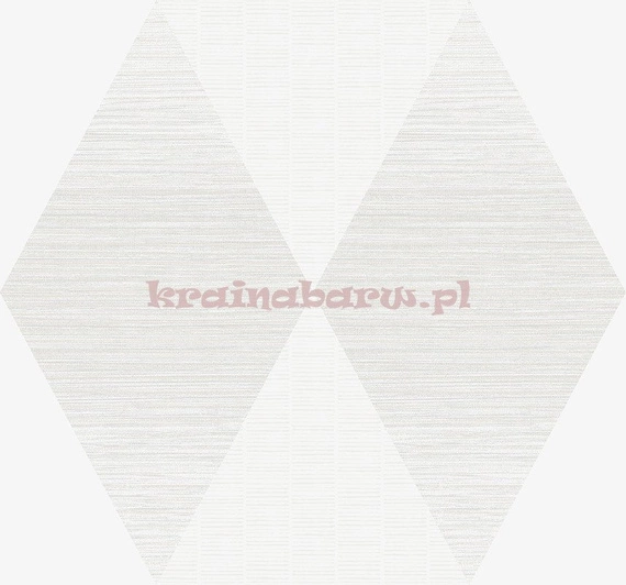 Tapeta w romby. Posiada wyczuwalną fakturę w przecinające się, drobne paski. Układają się one zarówno w pionie i poziomie. Tapeta jest w odcieniach jasnego beżu i bieli z dodatkiem połyskującego koloru srebrnego.