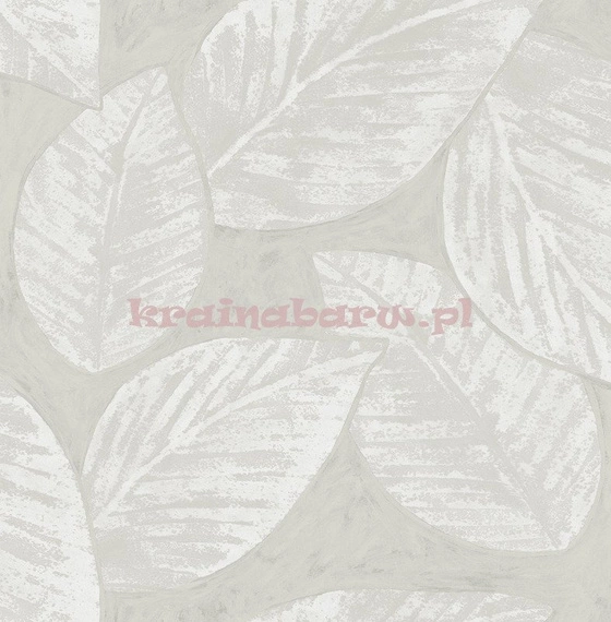 Tapeta z liśćmi naniesionymi na jednokolorowe tło. Kolory biały i srebrny.
