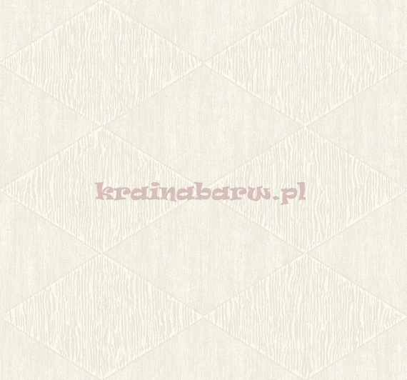 Tapeta z wzorem układającym się w romby. Dostrzeżemy na nich strukturę wzorowaną na drewnianych deskach. Faktura tapety jest delikatnie wypukła, wyczuwalna w dotyku. Jej kolor to odcienie bieli i szarości.