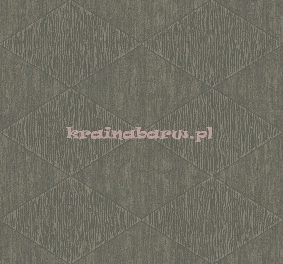 Tapeta z wzorem układającym się w romby. Dostrzeżemy na nich strukturę wzorowaną na drewnianych deskach. Faktura tapety jest delikatnie wypukła, wyczuwalna w dotyku. Kolor grafitowy z delikatnym połyskiem.