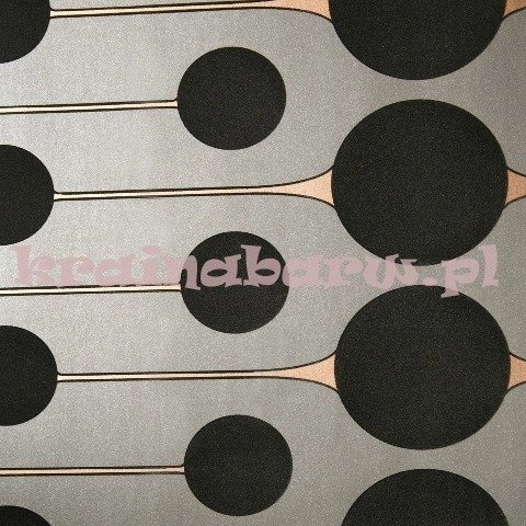 Srebrna tapeta z naniesionymi flokowanymi kołami. Są one w kolorze czarnym. Tapeta będzie doskonałym urozmaiceniem ścian luksusowego pomieszczenia.