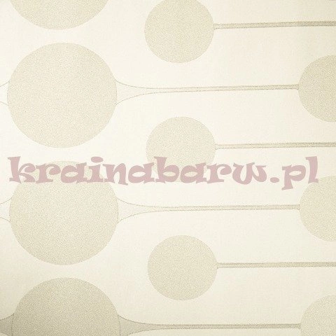 Tapeta z naniesionymi kołami w odcieniach bieli z dodatkiem szarości. Są one pokryte drobnym błyszczącym kwarcem. Tapeta nada blasku każdemu pomieszczeniu.