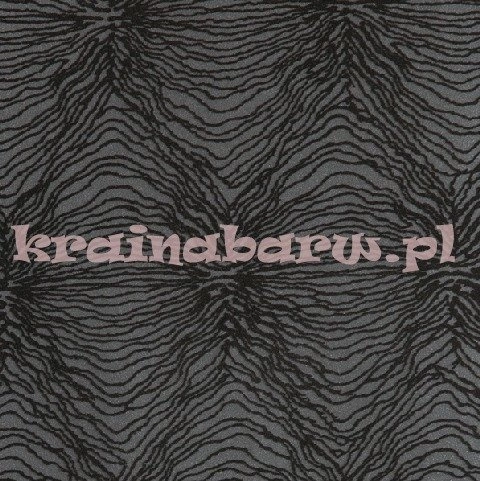 Szaro-grafitowa tapeta z naniesionym czarnym, flokowanym wzorem. Tło delikatnie połyskuje.