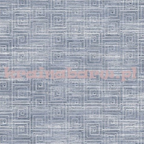 Tapeta z zygzakami układającymi się w prosty labirynt. Niebieski, jeansowy kolor. W niektórych miejscach wzór jest poprzecinany jasnymi poziomymi paskami.