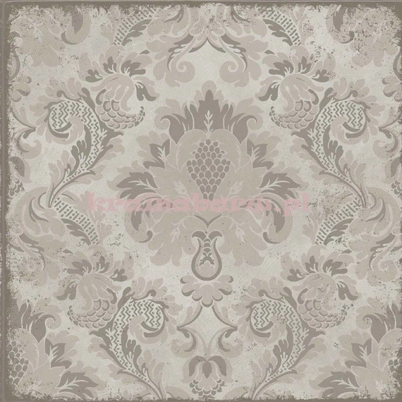 Klasyczny ornament, umieszczony w kwadratach. Sprawia wrażenie nałożonego na kafle. Tapeta jest w połyskującym metalicznym kolorze.