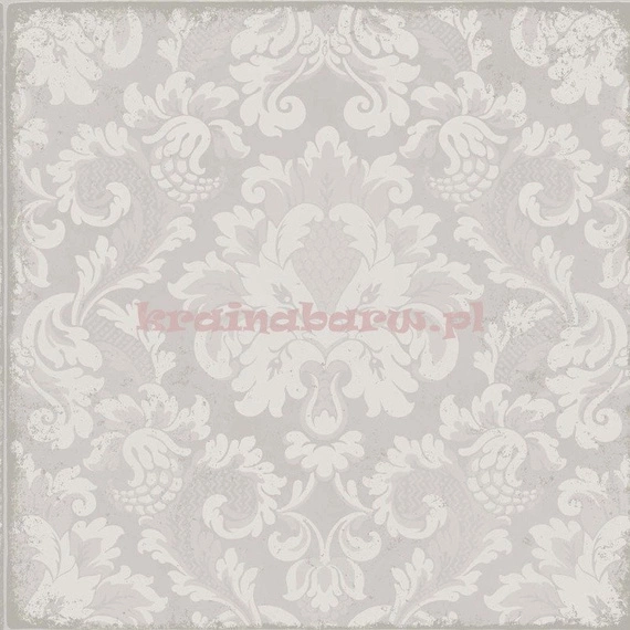 Klasyczny ornament, umieszczony w kwadratach. Sprawia wrażenie nałożonego na kafle. Tapeta jest kolorze jasnej, popielatej szarości.