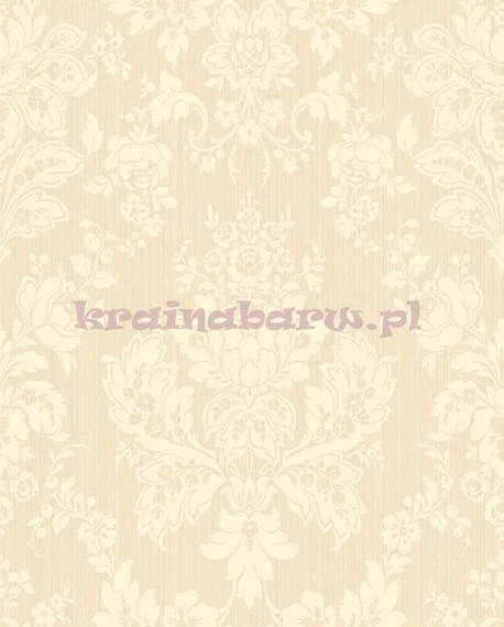Klasyczny, kwiecisty ornament. Naniesiony wzór jest w beżowym kolorze. Na tle widać delikatne pasy o złocistym połysku.