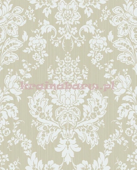 Klasyczny, kwiecisty ornament. Tapeta jest w odcieniach koloru beżowego. Na tle widać delikatne, połyskujące pasy.