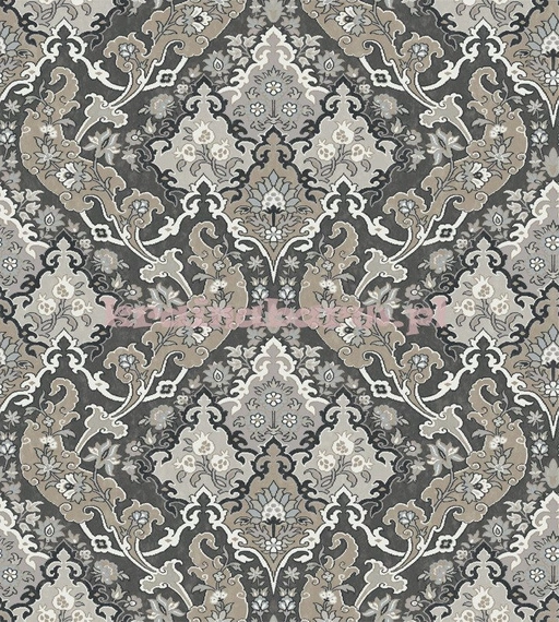 Kwiecisty, bogaty i różnorodny ornament. Przypomina wzór wyhaftowany na tkaninie. Gdy obejrzymy go z bliska, na kontury naniesionego wzoru skladają się drobne kwadraciki. Tapeta jest w odcieniach koloru szarego.
