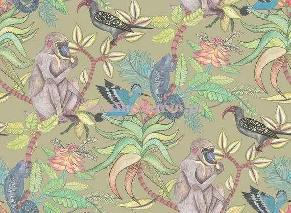 Tapeta z dzikimi zwierzętami oraz tropikalnymi roślinami. Widać tutaj ptaki, kameleona oraz małpkę jedzącą owoce. Kolorowy wzór naniesiono na kremowo beżowe tło.