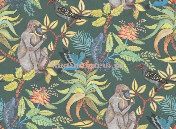 Tapeta z dzikimi zwierzętami oraz tropikalnymi roślinami. Widać tutaj ptaki, kameleona oraz małpkę jedzącą owoce. Kolorowy wzór naniesiono na zielone tło.