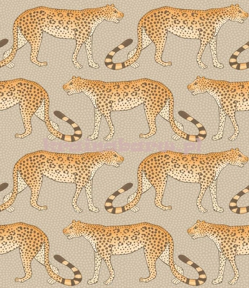 Tapeta ze spacerującymi leopardami. Nada ona wyjątkowy, afrykański klimat każdemu wnętrzu. Centkowane leopardy są w kolorze pomarańczowym. Znajdują się one na beżowym tle w kropki.