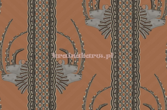 Tapeta z etnicznym wzorem. Widać na niej główy nosorożców z długimi rogami oraz pionowy pas z tradycyjną afrykańską plecionką. Tło tapety jest w kolorze brązowym. Naniesiony wzór ma jest w odcieniach pomarańczowego, szarego i czerni.