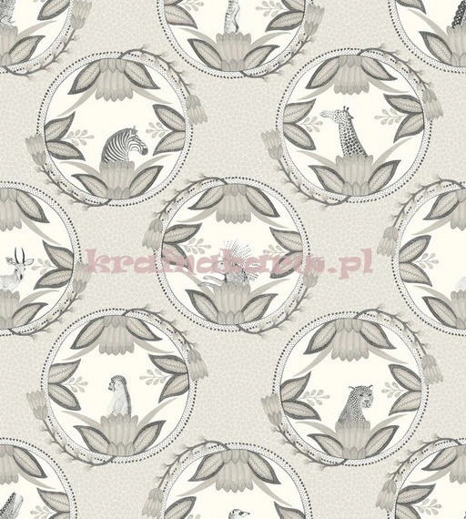 Tapeta z przedstawieniami zwierząt w okrągłych obramowaniach. Zostały one naniesione na tło przypominające skórę jaszczurki. Tapeta jest w szarawej kolorystyce.