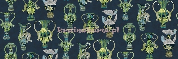 Tapeta z kolorowymi wazonami Ardmore. Są niepowtarzalnym połączeniem klasyki z nowoczesnością. Zauważymy na nich sylwetki zwierząt oraz tropikalną roślinność. Zielone wazony naniesiono na ciemno granatowe tło.