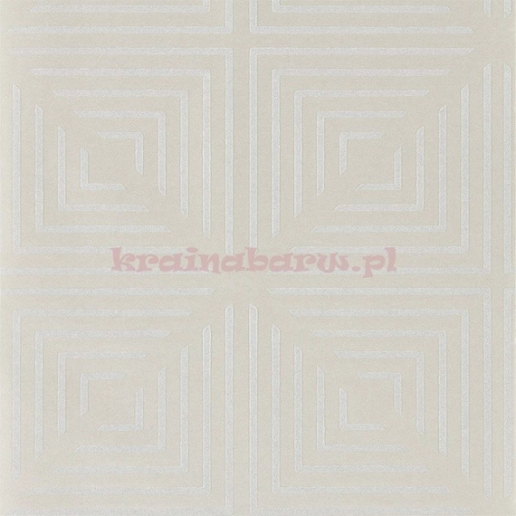 Tapeta z kwadratowym wzorem. Jest on poprzecinany ukośnymi liniami. Geometryczny motyw został jest naniesiony srebrzystymi liniami pokrytymi kwarcem. Tło tapety mieni się na srebrzysto beżowy kolor.