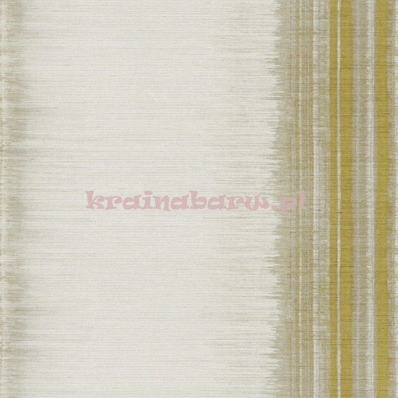 Tapeta o grubej, odpornej na uszkodzenia fakturze. Naniesiony na nią wzór przypomina starą, pofarbowaną tkaninę. Na tapecie dominuje kolor szary. Widoczne pasy są w kolorze żółtym. Tapetę można nakładać pionowo lub poziomo jak na aranżacji.