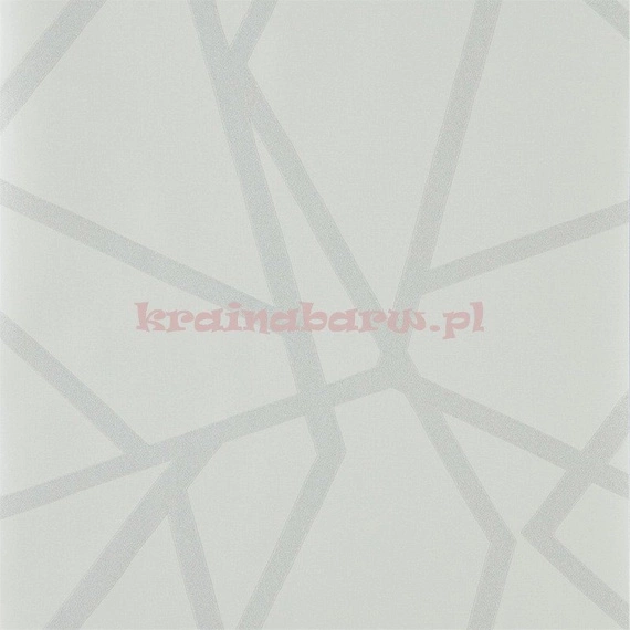 Tapeta z różnej wielkości trójkątami. Zostały one naniesione na białe tło. Ich obrys składa się z drobnego, połyskującego kwarcu.