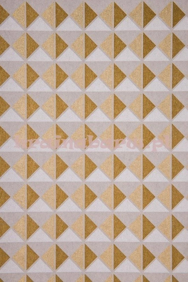 Wzór geometryczny składający się z symetrycznie ułożonych trójkątów. Mieni się na nim kolor złoty wraz z odcieniami barwy szarej.
