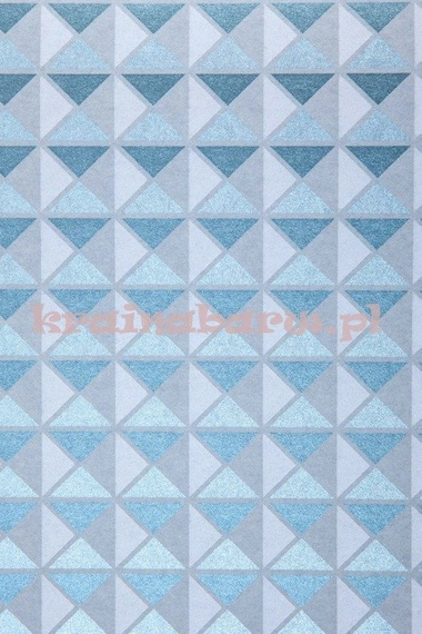 Wzór geometryczny składający się z symetrycznie ułożonych trójkątów. Mieni się na nim kolor niebieski oraz szary.