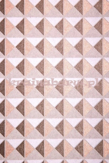 Wzór geometryczny składający się z symetrycznie ułożonych trójkątów. Mieni się na nim kolor różowy, srebrny, szary i biały.