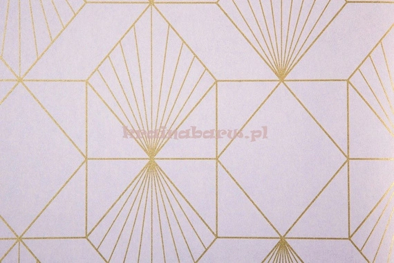 Tapeta z geometrycznym, złotym wzorem, który układa się w trójkąty, romby i kwadraty. Jest w kolorze jasno różowym.