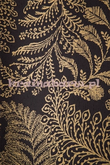 Na tapecie znajdują się liście paproci. Są one w kolorze złotym i naniesiono je na czarne tło.